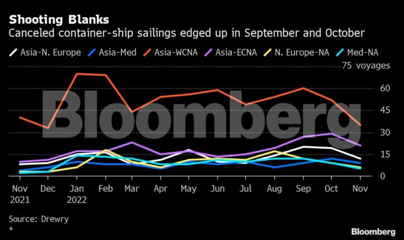 By some measures, the untangling of transport snarls is happening just as fast as the system knotted up last year. That’s not welcome news for companies that have prospered in the chaos. Spot rates for shipping containers have plunged about 60% this year as carriers struggle with the opposite problem they faced a year ago — excess capacity. Like airlines that cancel half-booked flights, the carriers are reducing the number of individual voyages in a practice called “blank sailings” — or cutting entire service loops altogether — to match their available space with demand, according to figures from Drewry: