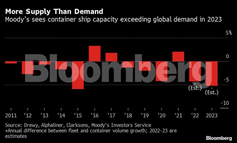 New ships launching in 2023 and 2024 may hasten the industry’s reversal of fortunes. The order-book-to-fleet ratio of 28% is the highest since 2010, according to Moody’s, and that increase in capacity will exceed projections for global trade volumes. “Although service reliability issues and elevated freight rates will likely persist into 2023 as the transportation ecosystem continues to right itself, we believe that carriers’ earnings have now peaked as an increased supply of vessels meets weakening demand,” the Moody’s report stated. Here’s how that mismatch looks this year and next:
