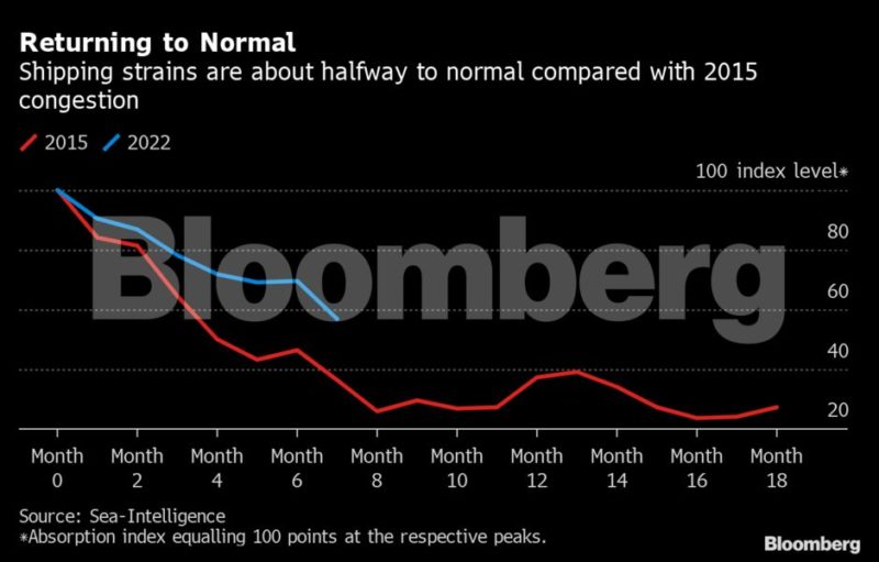 The following charts show how much progress has been made toward ending the gridlock, starting with analysts at Copenhagen-based Sea-Intelligence. They noted in a report last week that about half of the shipping congestion has been resolved, and by one measure, “a full reversal to normality should come in March 2023.” Another Sea-Intelligence model that compares the current situation to snarls experienced in 2015 concurred that “normal” is within reach in early 2023, barring any more unexpected disruptions: