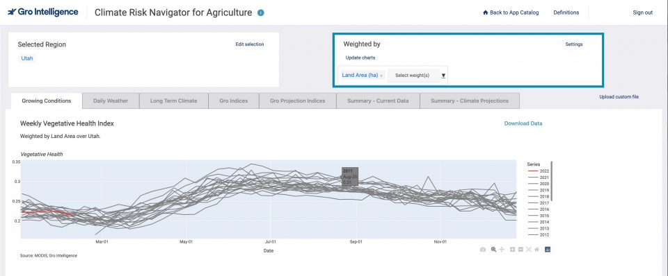 The Climate Risk Navigator for Agriculture helps Gro users evaluate and compare crop growing conditions and crop health anywhere in the world. Its global climate indicators (GCIs) use soil moisture, precipitation, temperature, vegetative health, and other weather and long-term climate metrics as inputs.