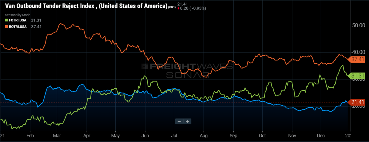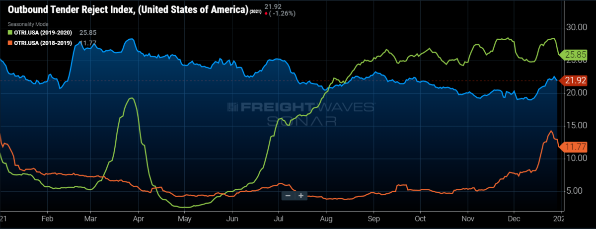 As contract rates increase in 2022 and capacity continues to enter the market, rejection rates will likely continue the decline after drivers return to the road following the holidays.