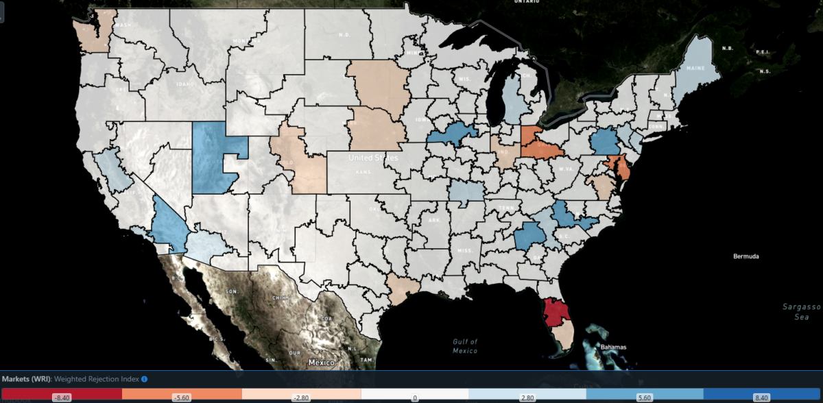 The map above shows the Weighted Rejection Index (WRI), the product of the Outbound Tender Reject Index — Weekly Change and Outbound Tender Market Share, as a way to prioritize rejection rate changes. With capacity tightening around the country, there are a lot of blue markets, which are the markets to focus attention on.