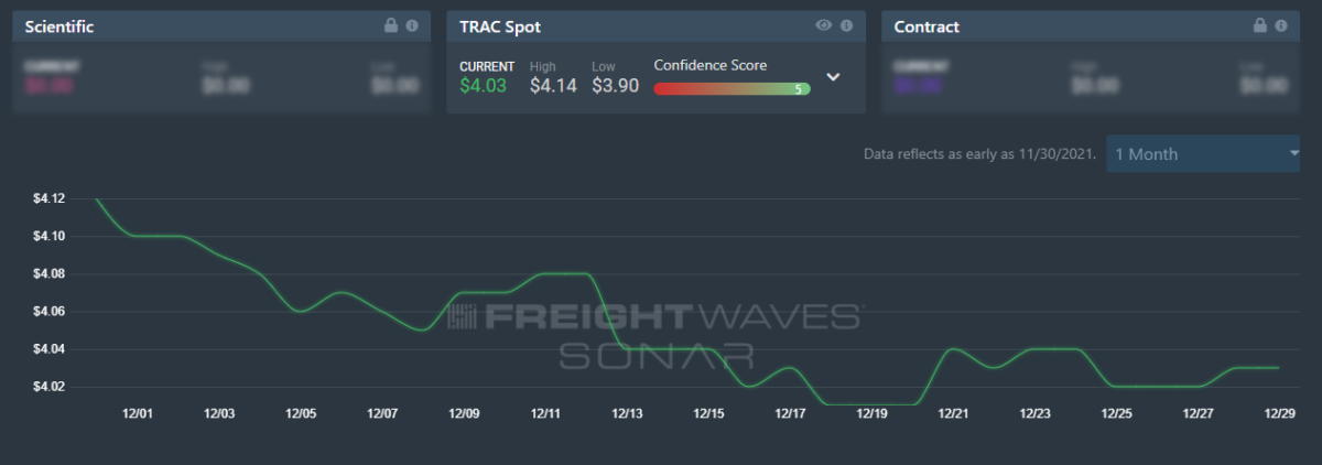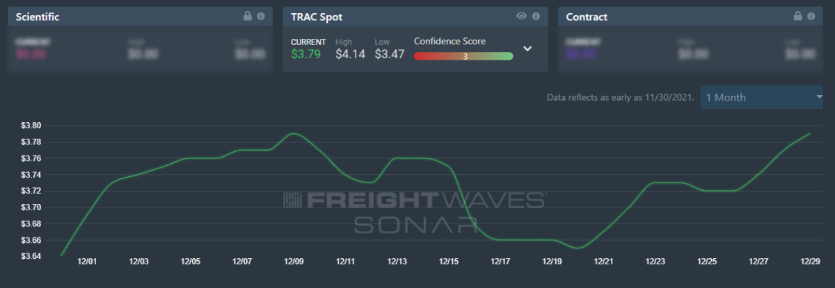 FreightWaves’ Trusted Rate Assessment Consortium (TRAC) spot rate from Los Angeles to Dallas increased modestly over the past week. The FreightWaves TRAC rate in this dense lane increased by 1 cent per mile to $4.03. Expect some upward pressure throughout next week as volume imbalances will likely tighten capacity in Southern California in the coming days.