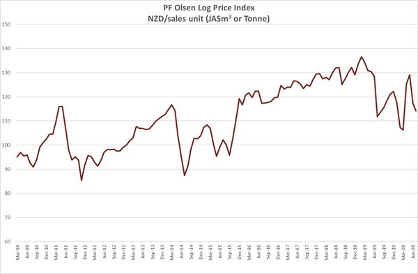 Due to the decreases in export log prices, the PF Olsen Log Price Index decreased $3 in July to $114. The index is currently $9 below the two-year average, $11 below the three-year average, and $8 below the five-year average.