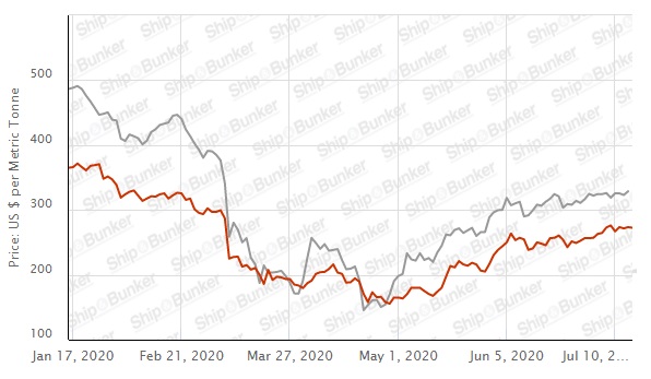 (IFO380) (red line) versus Brent Oil Price (grey line)