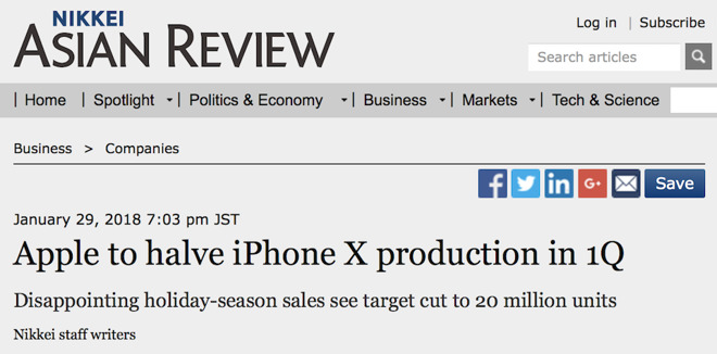 The Nikkei has previously issued alarmist reports from people supposedly “familiar” with Apple’s production, its supply chain partners, and the demand among consumers for its products. These have regularly proven to be false. They were not minor errors. The Nikkei specifically claimed to know via “channel checks” that iPhone X had suffered “disappointing holiday season sales” in early 2018, immediately before it was revealed that iPhone X was the world’s most popular smartphone throughout its debut quarter.