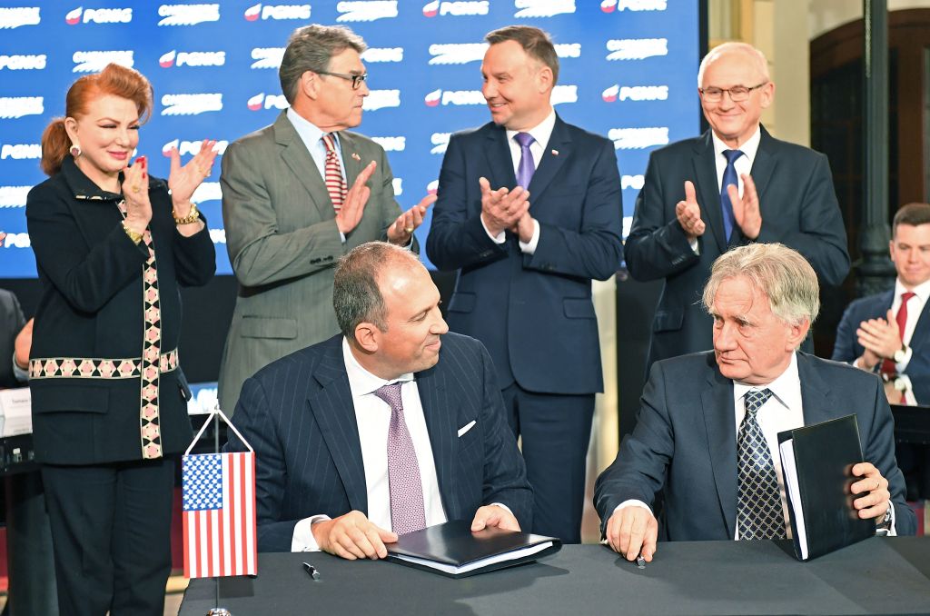 Anatol Feygin (left), vice-president of US company Cheniere Energy, and CEO of Polish oil and gas company PGNiG Piotr Wozniak (right) signing a 24-year US deal to deliver LNG to Poland, November 2018, Warsaw. (Photo by Janek Skarzynski/AFP via Getty Images)
