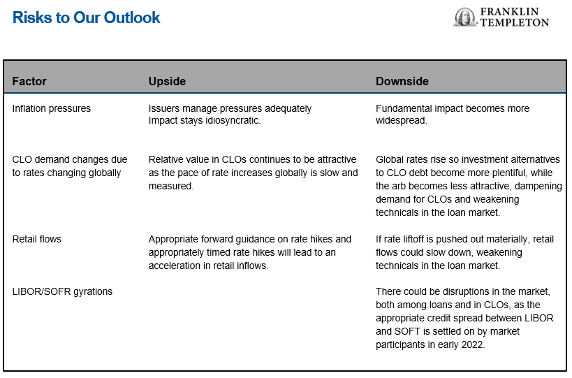 Despite the potential headwinds that persistent inflationary pressures could bring, we continue to believe that supply chain disruptions and inflation have the potential to delay, but not derail, full recovery. We also do not expect a high probability of large-scale fundamental weakness in the loan market over the next year, especially to such a degree that it eclipses the significant technical tailwinds for floating rate assets. We maintain our constructive outlook for the bank loan sector—over the next 12 months, technical conditions should remain strong and fundamentals broadly constructive with subdued default rates, against the backdrop of a rising interest-rate environment.