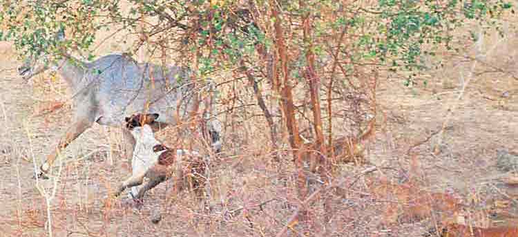 Dogs chasing a nilgai in a tiger reserve in southern India. Photo: Chenduraju