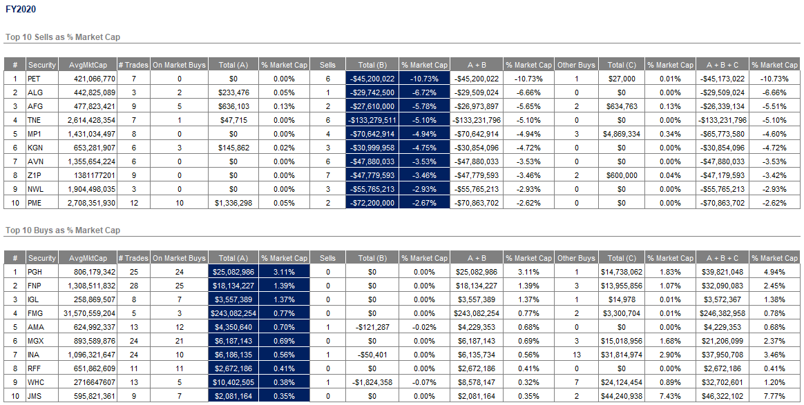 Following insiders’ leads in buying and selling decisions is a bit like Sex Panther perfume (per the movie Anchorman), 60% of the time it works every time. This was evident in our review of historical literature and in the director trades of FY2019 and FY2020. We make the following points, some of which are somewhat obvious.