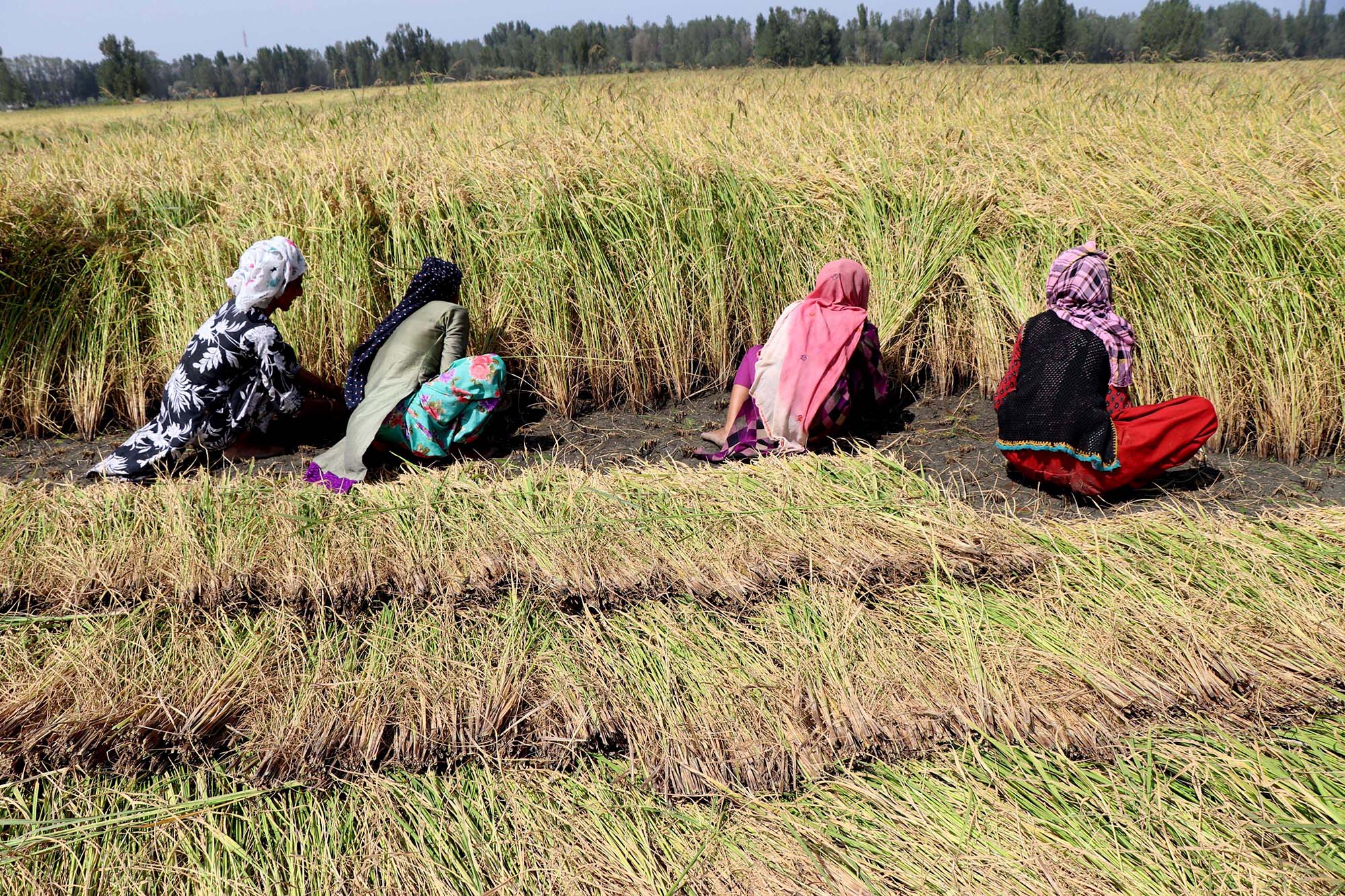 Kashmiri Muslim women harvests paddy at a rice field on the outskirts of Srinagar, Wednesday, October 3 2018.