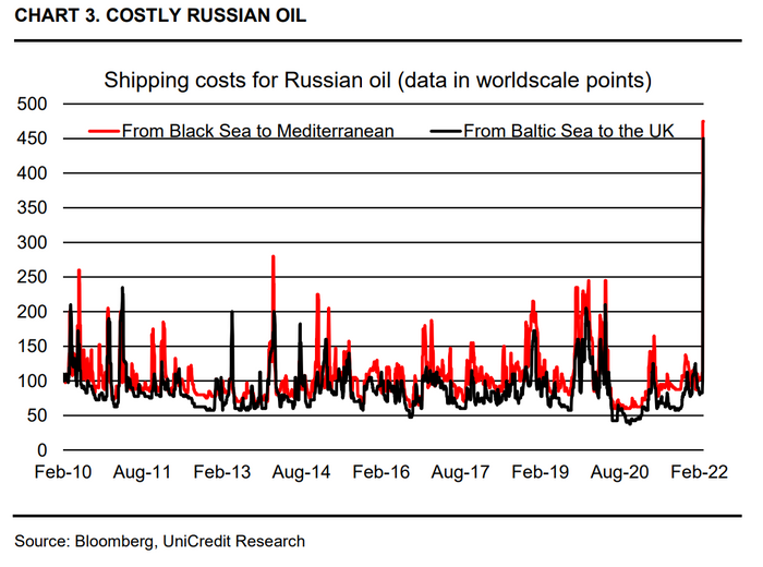 That geopolitical risk premium takes into account not only the risk of damage to oil facilities due to military action or potential Western sanctions, but also reflects soaring insurance costs to ship Russian oil. He observed that freight rates for oil coming out of both the Black Sea and Baltic sea more than tripling over the space of a few days as crude-oil buyers struggled to find shippers willing to send vessels into Russian ports (see chart below).