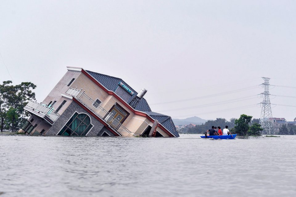 Residents riding a boat past a flood damaged house in China on July 15, 2020. The lack of certainty that came with COVID-19 has, in some ways, presented us with opportunities to strengthen community resilience.