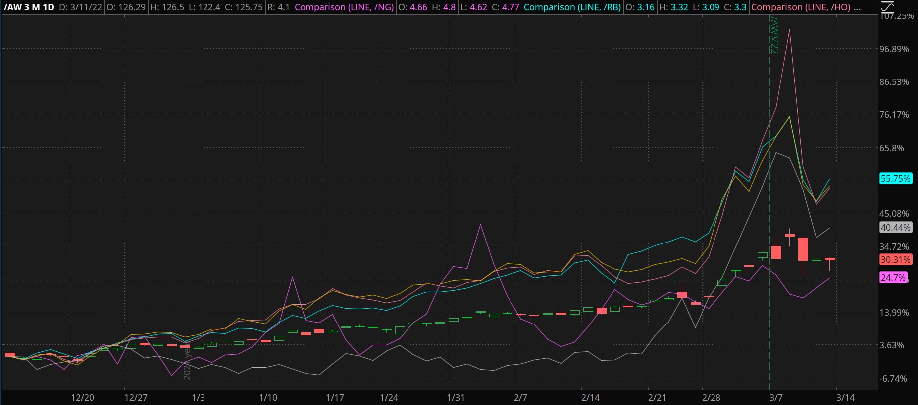 CHART OF THE DAY: INFLATION RACE. The Bloomberg Commodity Index futures (/AW—candlesticks) have risen 30.31% in the last three months. RBOB gasoline futures (/RB—blue) rose 55.75%. WTI crude oil futures (/CL—yellow) have risen 53.65%. Heating oil futures (/HO—red) climbed 52.71%. Wheat futures (/ZW—gray) rallied 40.44%. Natural gas futures (/NG—pink) are up 24.83%. Data Sources: ICE, S&P Dow Jones Indices. Chart source: The thinkorswim® platform. For illustrative purposes only. Past performance does not guarantee future results.