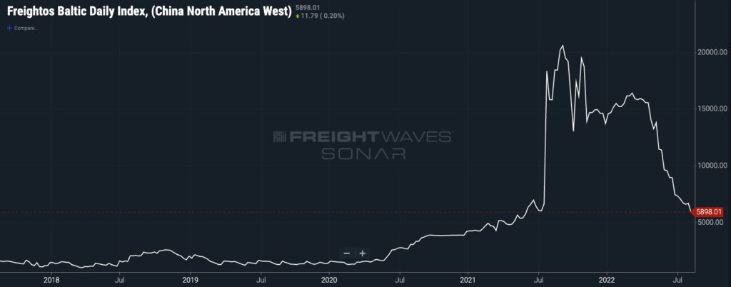 Headed below $4K? — Things change quickly in freight, especially when you’re not paying attention. FreightWaves CEO and founder Craig Fuller offered up this bold prediction on Twitter: “Container rates from China to US West Coast will be down to $3900 by November, off more than 80% from their peak of $20,586 set a year ago.” By the time you take off your Halloween costume, will rates be more treat than trick? With some shippers already paying under $4K on 20s, saving a fortune may favor the bold … prediction.
