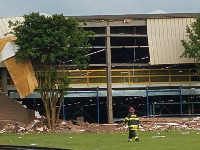 Severe wind damage tore away around half an external wall from the Gildan Distribution Center in Mebane on Friday, while the area was under a Tornado Warning.