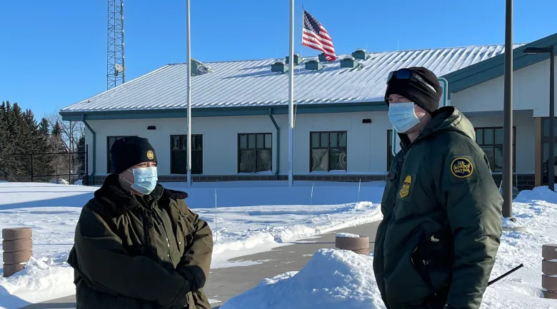 U.S. Border Patrol agents Katy Siemer, left, and David Marcus stand outside the Customs and Border Protection facility in Pembina, N.D., on Tuesday, Jan. 25, not far from where agents intercepted a group of undocumented Indian nationals Jan. 19. (James McCarten/Canadian Press)