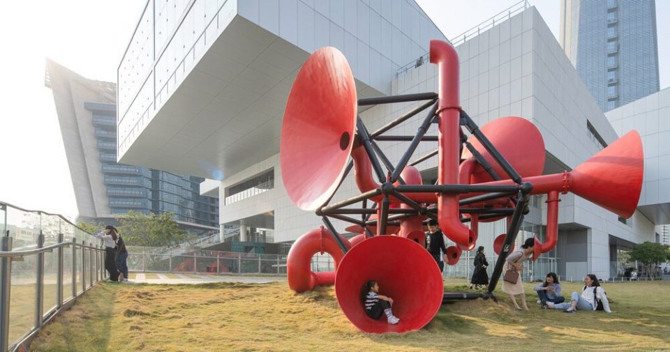 with its newly completed ‘social network factory,’ people’s architecture office (PAO) activates the public space of the sea world culture and arts center in shekou, shenzhen. the playful, design-minded installation rises nearly 20 feet in height and hosts four sets of surrounding ‘pipe horns’ intertwined in a spatial grid. the horns of the bejing-based studio’s installation reach outward in multiple directions, mirroring the cantilevered volumes of the culture and art center designed by architect fumihiko maki.