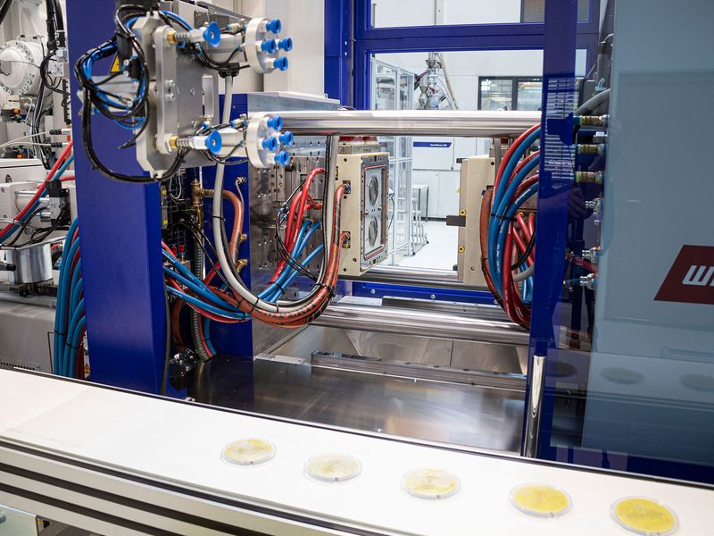• The MicroPower 15/10 production cell for medical applications, such as the production of micro parts in a clean room. With 15 tons (150 kN) of clamping force, it was demonstrated producing PC retaining rings with a part weight of only 2 mg for miniature tubes. The machine comes with a rotary unit, an integrated robot and a camera for complete parts inspection. Following removal and camera inspection, the parts are transferred to transport containers.