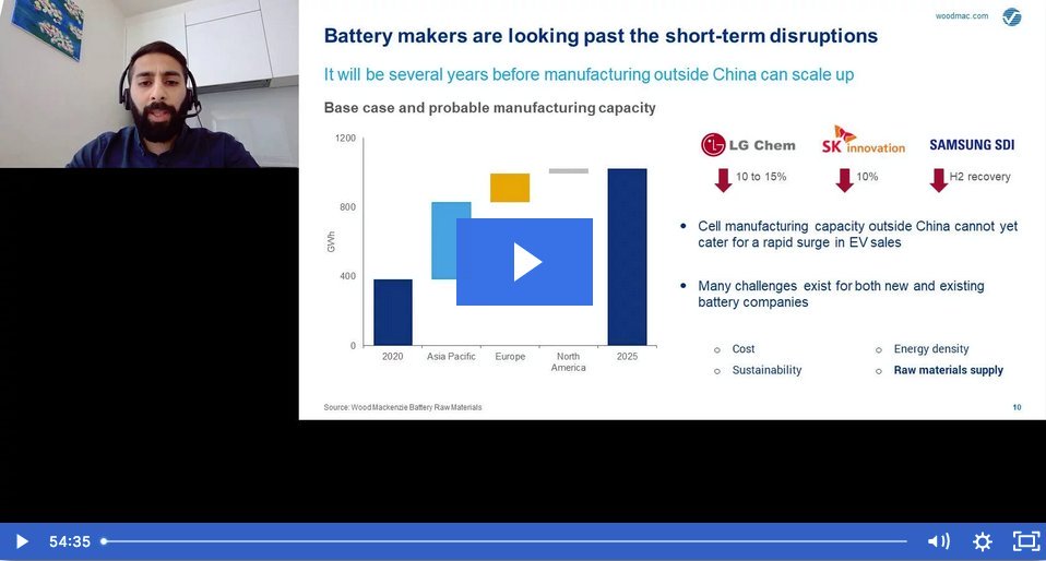 On June 3, 2020, Wood Mackenzie hosted a webinar looking at the coronavirus impact on battery raw materials, energy storage and electric vehicles. Wood Mackenzie’s team of analysts examine the supply chain impacts and discuss the effect, if any, on deployment. The format includes a panel conversation followed up by an in-depth Q&A.