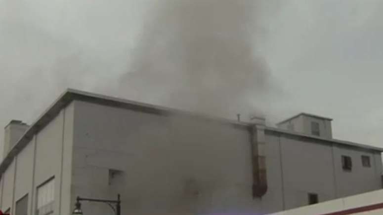 Firefighters responding to reports of a boiler problem at the Washington Street factory around noontime found flames shooting out of a smokestack.