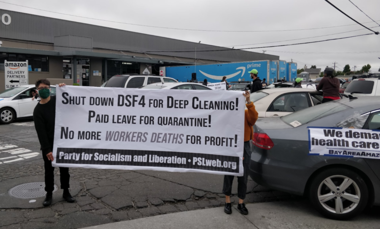 A coalition including Bay Area Amazonians, Tesla workers, Gig Workers Collective, People’s Strike Bay Area, Workers United Against COVID-19, and the Party for Socialism and Liberation held a car caravan to deliver a petition to the warehouse. The fiery and energetic action blocked entrances and exits to the facility — halting all shipping and loading activity — to demand the warehouse be shut down for deep cleaning, and all workers be given two weeks off with pay to quarantine.