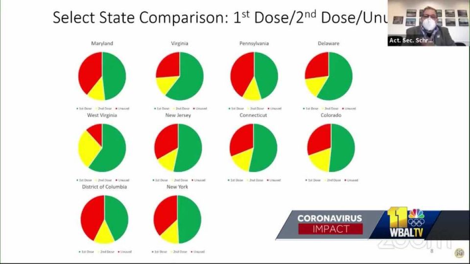 Maryland’s acting secretary of health was in the hot seat again Monday evening as the state Senate held another vaccine oversight workgroup meeting.|| Coronavirus updates | Maryland’s latest numbers | Get tested | Vaccine Info ||The group has concerns about why Maryland isn’t doing better with the distribution.Maryland online vaccination site locatorVaccine Data DashboardMaryland vaccination plan FAQsAccording to the data presented, Maryland is not improving compared to other states as far as vaccine distribution. A couple of weeks ago, the state ranked 40th out of 51. Now, the state ranks 44th and state senators want to know why.“We have two priorities: One is balancing speed with equity,” Acting Secretary of Health Dennis Schrader said.Schrader gave his weekly vaccine distribution briefing to state senators who questioned why Maryland is still holding on to shots to use as second doses, despite a federal recommendation to use all the shots they have now.“What we do know is every one of those second doses that’s been received has someone’s name on it and what we don’t want to do is give it away to someone else when its got somebody’s name on it,” Schrader said.“You put the name on it. The federal government didn’t put the name on it, Mr. Secretary. You put the name on it,” State Sen. James Rosapepe, D-Prince George’s and Anne Arundel counties said.Two mass vaccination sites opened in the last week. Schrader said 12,000 appointments were booked in 30 minutes.One senator questioned if the doses allocated for those sites take away from those for county health departments.“We had 73,000. We did get now 88,000, so there was an increase of 16,000, so we’re using about 14,000 a week for the mass vax sites, so you could say we’re using the increase for that,” Schrader said.Several senators also said they’re hearing from constituents that the process of signing up is frustrating. There are now 2,000 providers around the state, and they have to sign up with each one separately.Sen. Clarence K. Lam, D-Baltimore and Howard counties, said he would like to see a single signup system.“There’s no ability for a one-stop shop?” Lam asked.“I don’t think that would be in our best interest because there’s a very high-risk we could create a single point of failure,” Schrader said.“Right now, you have a lot of different points of failure,” Lam said.“Well, no, I would argue that we’ve got 84% of the first doses that have been administered and there are many appointments. So, we are getting a very high rate of immunization in the state,” Schrader said.Schrader pointed out that a lot of these issues are due to the limited supply of vaccine, but he’s hopeful that will change soon if the Johnson & Johnson vaccine gets FDA approval.