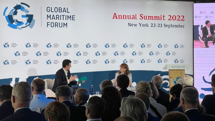 UNCTAD Photo | Rebecca Grynspan (right) speaks to moderator Nicholas Davis at the annual summit of the Global Maritime Forum on 22 September 2022.