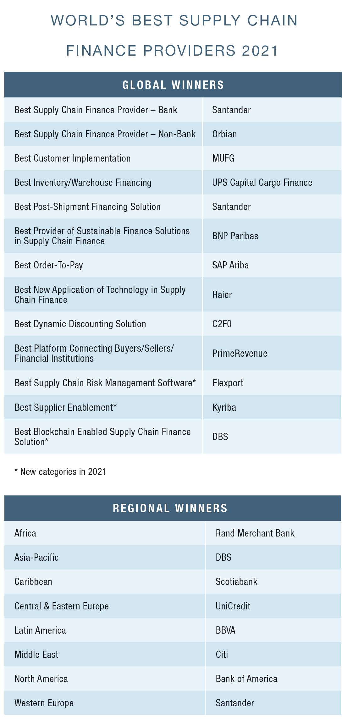 Global Finance names the World’s Best Supply Chain Finance Providers for 2021, noting growth and innovation taking place in the long tail of SMEs.