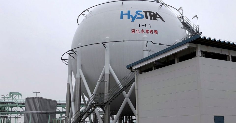 The logo of the CO2-free Hydrogen Energy Supply-chain Technology Research Association (HySTRA) is seen on a liquefied hydrogen storage tank built by Kawasaki Heavy Industries at the hydrogen receiving terminal at the Kobe Airport Island in Kobe, western Japan January 22, 2021. REUTERS/Yuka Obayashi/File Photo