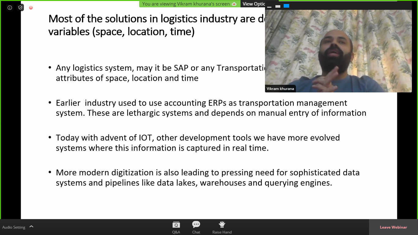 Vikram Khurana, Head of Analytics and Business Intelligence at Delhivery talked about the abstraction of problems to run a logistics business and explored some of the analytics case studies in logistics which are helping an organization in this modern era of data. Vikram explained that most of the solutions in the logistics industry are defined around 3 important variables that are space, location and time as well as discussed some use cases on network design and projections.
