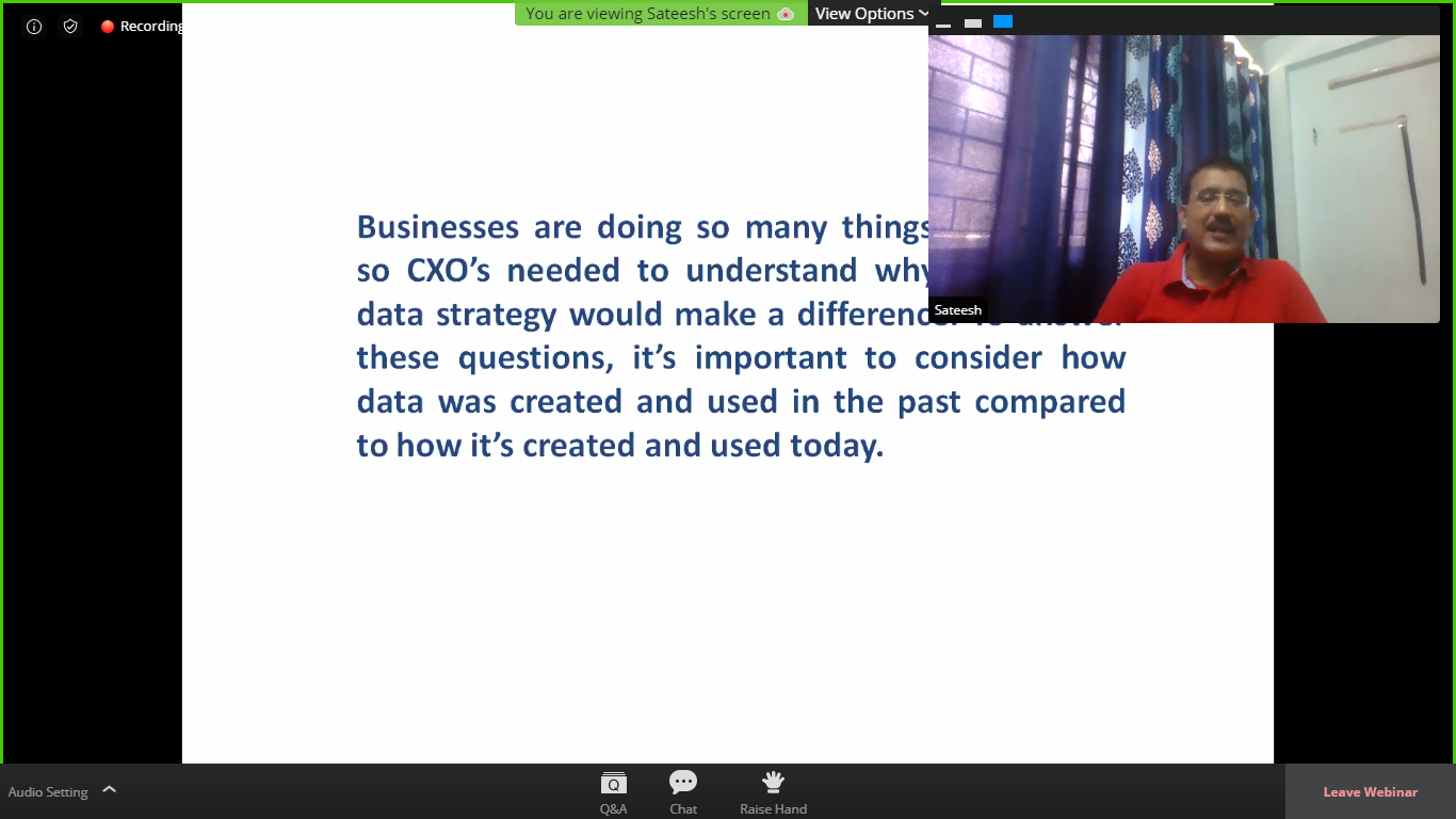 In this talk, Sateesh Rai, Head-Analytics at Orient Electric talked about the importance of data in an organisation. Sateesh explained the components of data strategy and depicted that CXOs need to understand why and how a data strategy would make a difference, how data was created and used. He discussed the various challenges in the organisational growth and business strategy that include lack of a clearly articulated business strategy, lack of cross-business, lack of priority, etc. and how business strategy comes first than data strategy.