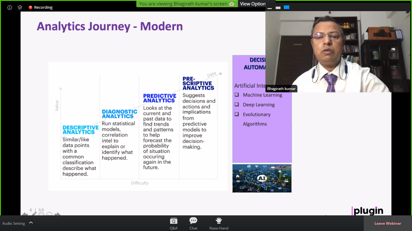 In this talk, Bhagirath Kumar Lader, Chief Manager, Business information System at GAIL discussed the essentials of AI, deep learning and machine learning, how to distinguish between the hype and reality, applications of AI in business, among others. Bhagirath explained the modern Analytics journey that includes descriptive analytics, diagnostic analytics, predictive analytics, etc. as well as the wall of analytics that needs to be broken through prescriptive and predictive analytics.