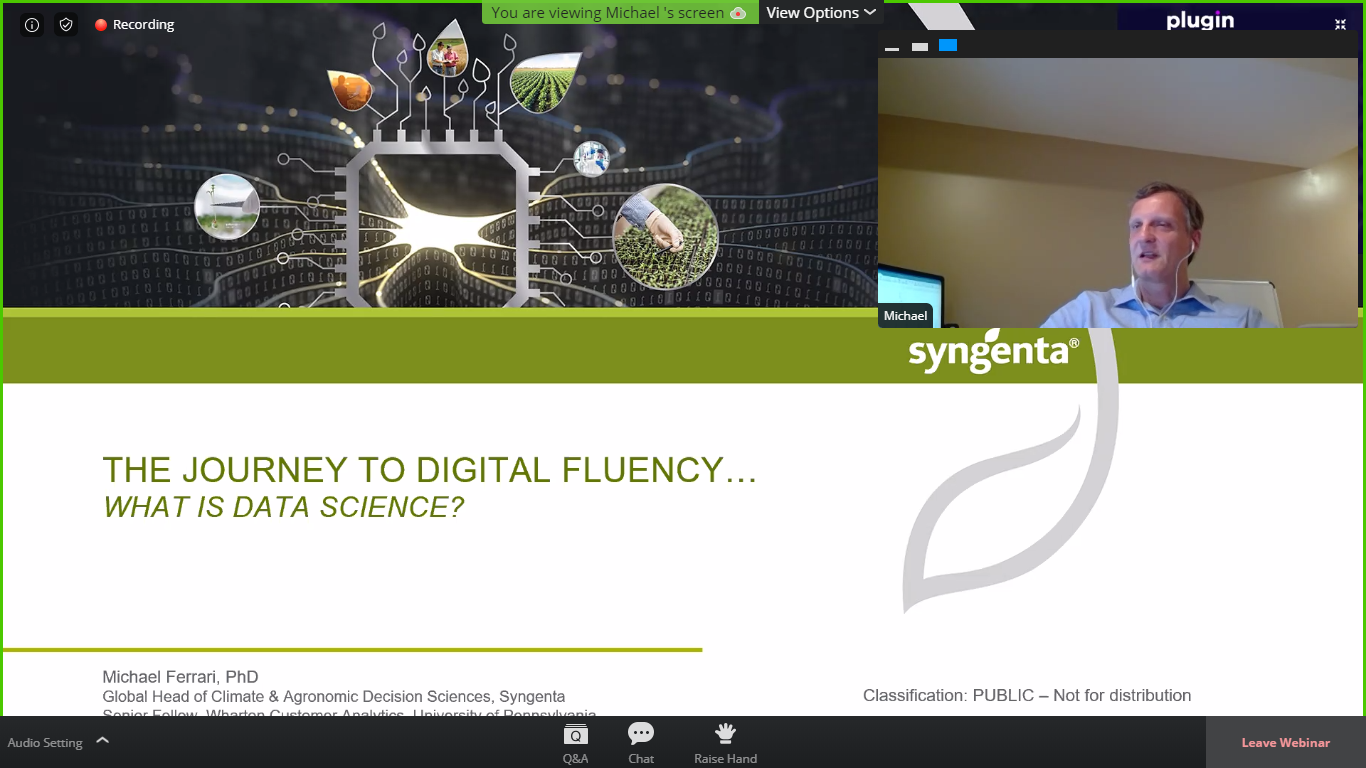 In this talk, Michael Ferrari, Global Head of Climate & Agronomic Decision Sciences at Syngenta explained topics like quantamental that is a fusion of fundamental and quantum, digital fluency and hoe data science is related to digital fluency. He discussed how the notion of the ‘one size fits all’ data scientist has evolved to be a fictitious character, the benefits of focusing on Beta instead of Alpha, and the importance of domain expertise for data science to continue to evolve and provide value to organisations.