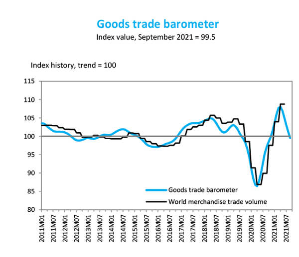 “Recent supply shocks, including port gridlock arising from surging import demand in the first half of the year and disrupted production of widely traded goods such as automobiles and semiconductors, have contributed to the barometer’s decline,” the WTO writes in its release of the indicator. “Following its sharp rebound from the initial shock of the COVID-19 pandemic, global merchandise trade is slowing, with production and supply disruptions in critical sectors dampening growth alongside cooling import demand.”