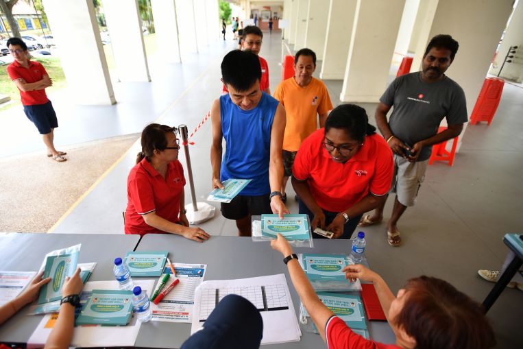 Mr Darryl David, adviser for Ang Mo Kio GRC Grassroots Organisations, who was at the Ang Mo Kio-Hougang Zone 1 RC, said that an open, clear area had been chosen for the distribution in anticipation of long queues.