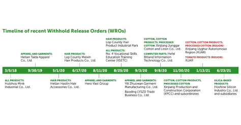 -US Customs and Border Patrol (“CBP”) has issued Withhold Release Orders (“WROs”) applying to cotton, tomato, apparel, hair products, silica-based products, and computer parts from Xinjiang.