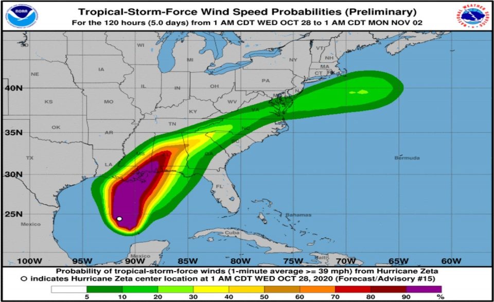 Zeta is forecast to make landfall in southeastern Louisiana by Wednesday afternoon before moving across the southeastern United States on Thursday. By early Wednesday morning, Zeta was about 300 miles south southwest of New Orleans and was projected to gain additional strength.